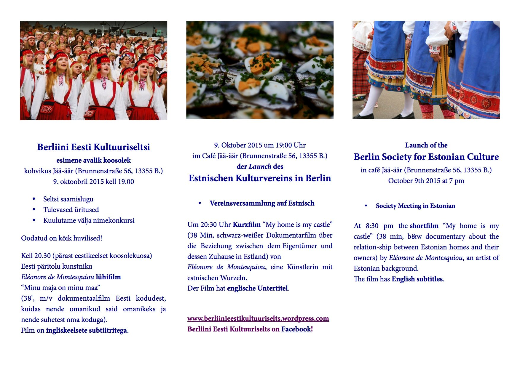 Berliini Eesti Kultuuriseltsi juhatusel on rõõm kutsuda teid esimesele avalikule koosolekule reedel, 9. oktoobril 2015 kell 19.00 kohvikus Jää-äär (Brunnenstr. 56, 13355 Berliin).
