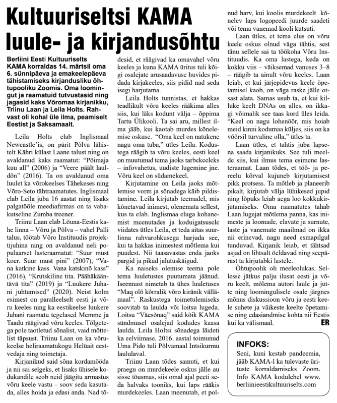 Kama 6. kevadise sünnipäeva saabumisega korraldab Berliini Eesti Kultuuriselts emakeelepäeva puhul virtuaalse luuleõhtu, millega on teretulnud ühinema kõik eesti ja ka võro keele huvilised! Plaanime meeleolukat kokkusaamist Zoomi keskkonnas, kus on kavas vestelda nii võro kui eesti keeles, lugeda kirjapalu, luulet ja ka laulda. Luuleõhtu teemadeks on mitmekeelsus, kodu(igatsus), kodukeele tähtsus, võro ja eesti keele prestiižiküsimused (mis on üllatavalt sarnased võro ja väliseesti peredes)… Ja plaan on muidugi rõõmu tunda uutest muljetest ja saabuvast kevadest, täis lootust ja värskeid ideid. Nii et vahet pole, kas Sa asud sügavas Võromaa metsas, Berliinis või kes teab kus, ühine meiega!