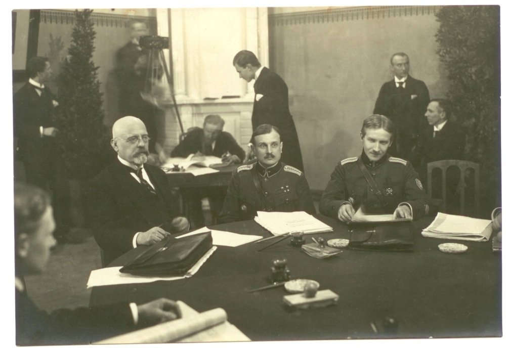 Eesti delegatsiooni liikmed Tartu rahu sõlmimisel. Vasakult: J. Poska, kindral J. Soots, kolonel V. Mutt. Foto: Armin Lomp, Ajaloomuuseum